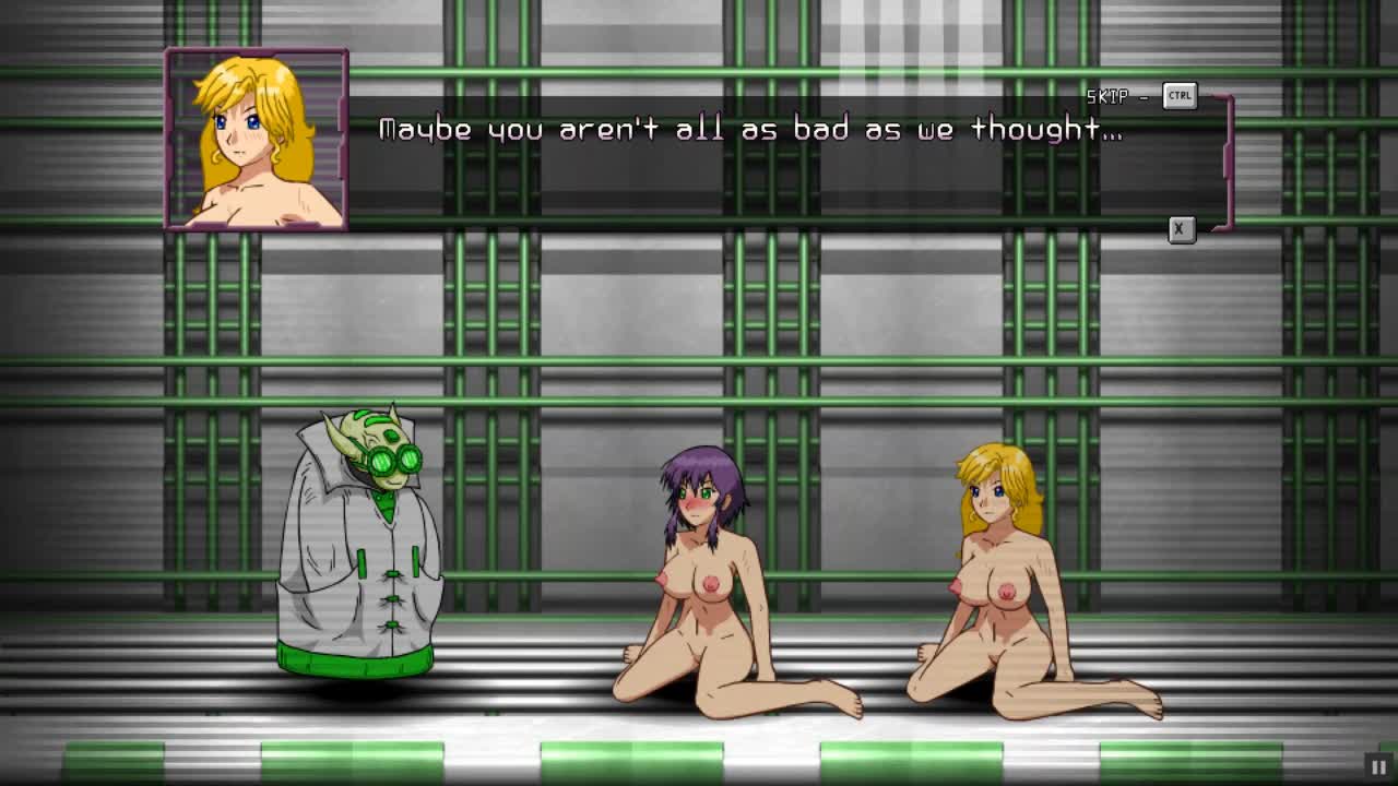 Captain Firehawk says, 'Strip naked, giant alien girl in red latex!' in hentai episode 1.
