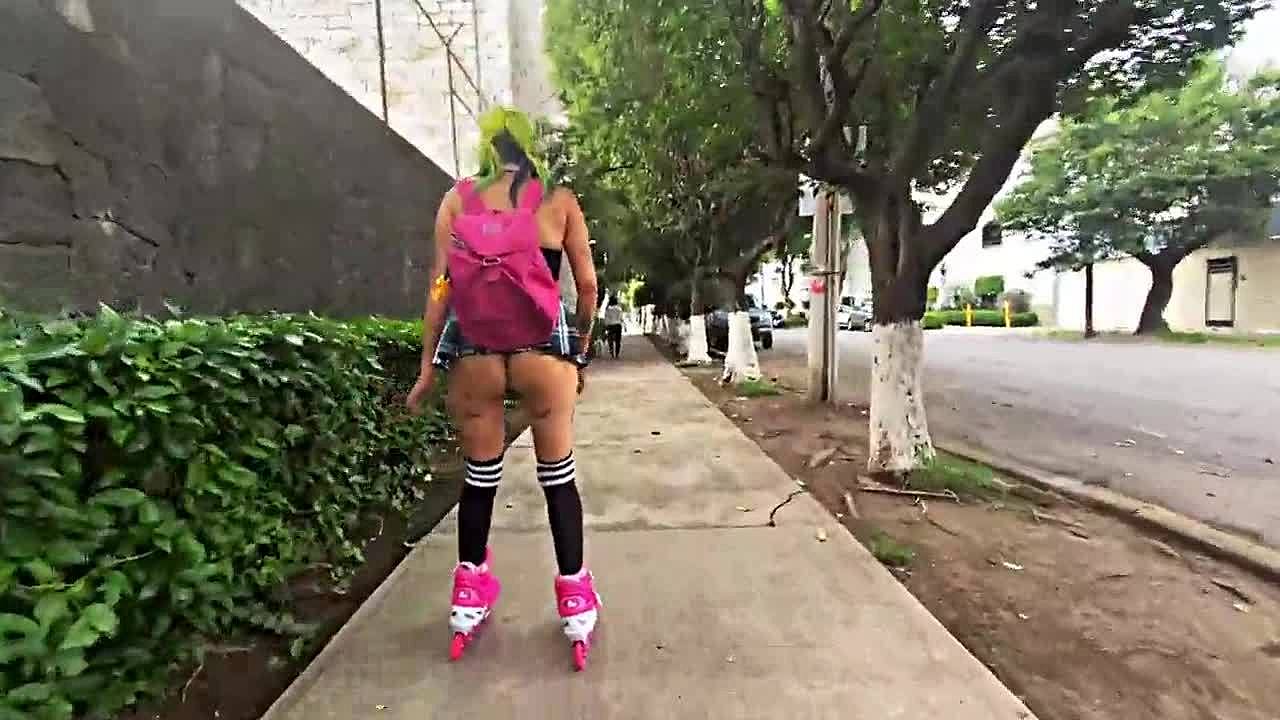 Big-assed latina learns skating, flashing her ass in miniskirt